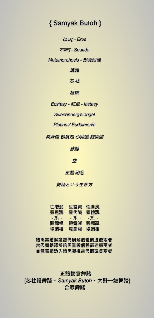 因此所謂的Samyak Butoh,以其身心立基面來看可直稱為芯柱體舞踏和大野一雄舞踏。然而那也只是階段目標,它真正在倡議的是對於舞踏能有一全面而透徹,正體而祕意的認識。於是我們得以在舞踏的源頭處找到它之所以是舞踏的根本原因,積合且蘊藏那創始的能量,如此才能深釀出舞踏的未來,善用舞踏之於人類真正的價值與意義。